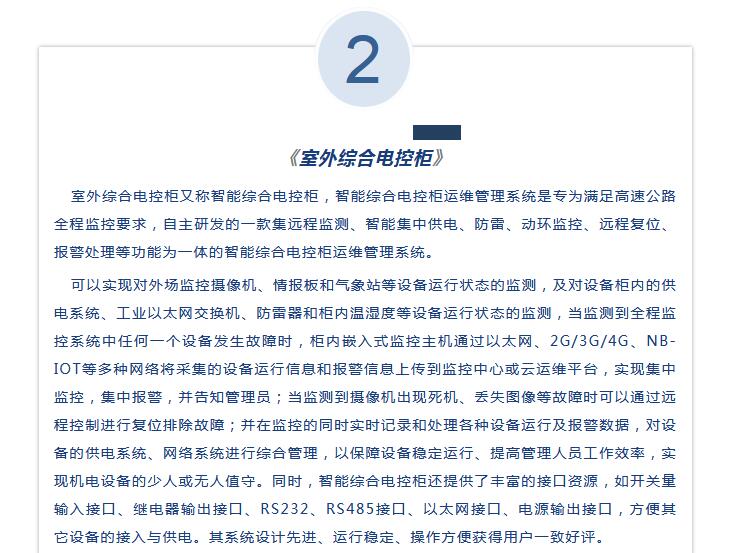 近日,和嘉科技簽署了京德高速機電工程JD1、JD2標段項目合同,在此次項目涵蓋北京新機場至德州高速公路京冀界至津石高速段約87公里,共涉及149套高速公路智能運維箱、68套室外綜合電控柜(智能電控柜)、機房動力環境監控系統10套含PEMS-6806AS/T嵌入式監控主機、漏水監測、空調監測、煙感監測、門禁監測。