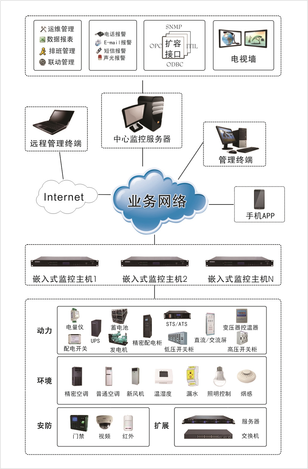 鐵塔動環監控系統通過將基站智能監控單元構建在底層被監控智能和非智能設備之上,實現全網動環監控、集中告警、實時性能監控、視頻監控等功能,并與電子運維模塊對接,實現對故障運維管理的統一派單,是生產運維管理的自動化工具。動環監控系統管理范圍涉及機房環境量(溫濕度、水浸、煙霧等傳感等)、網管動力設備(開關電源、空調、配電柜、UPS、油機等)、安防設備(視頻、門禁、消防等)。