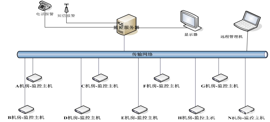 各基站機房通過有線網絡,將PEMS嵌入式監控主機采集數據上傳各監控中心,實現對各無人值守機房集中管理,系統網絡架構圖如下: