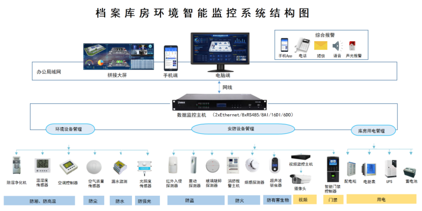 檔案倉庫環境智能監控系統包括環境設備管理、安全設備管理和倉庫電力管理,通過實時收集和監控環境和安全參數,實現倉庫環境的綜合安全管理:檔案倉庫環境監控系統功能涵蓋倉庫“十防”(防火、防盜、高低溫、防潮、防水、防光、防塵、有害氣體、昆蟲、霉菌)監控、監控和管理,集環境監控、設備管理、安全監控、電力監控、權限管理、報警管理于一體,有效保障檔案倉庫的環境安全。