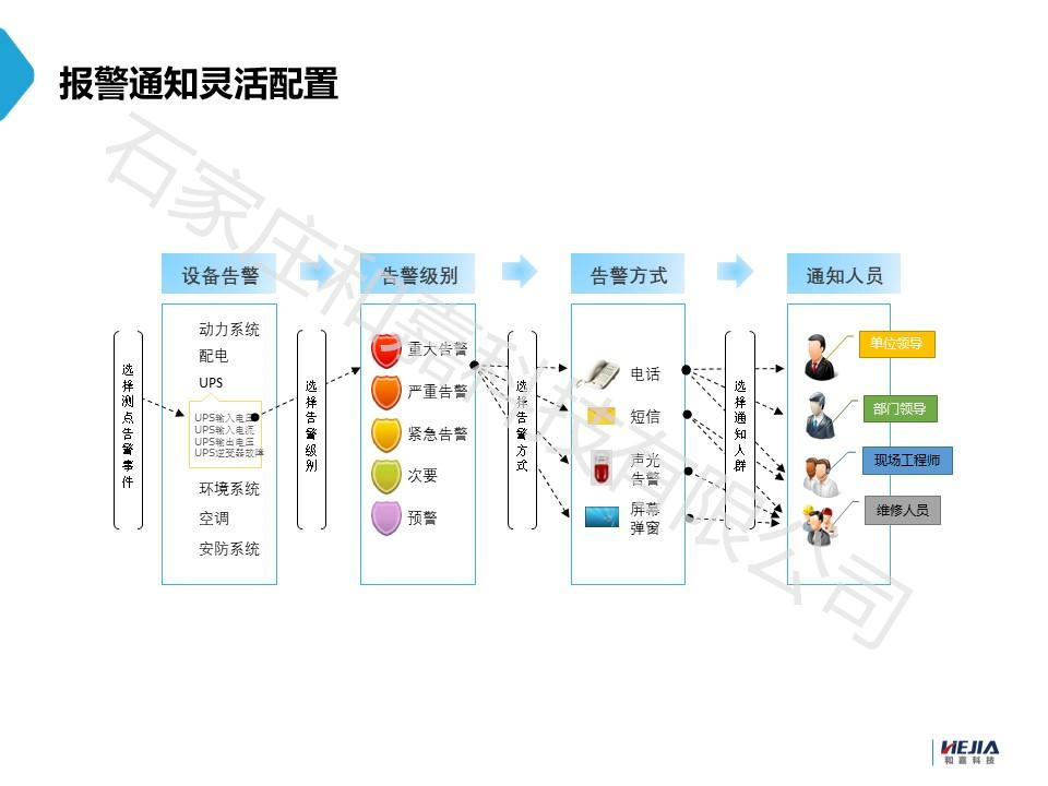 2、智能告警與通知:當(dāng)系統(tǒng)檢測(cè)到任何異常參數(shù)或設(shè)備故障時(shí),會(huì)立即觸發(fā)告警機(jī)制。告警通知可以通過(guò)多種方式發(fā)送給相關(guān)人員,如短信、郵件、電話、手機(jī)APP推送等,確保管理人員能夠迅速得知并處理。