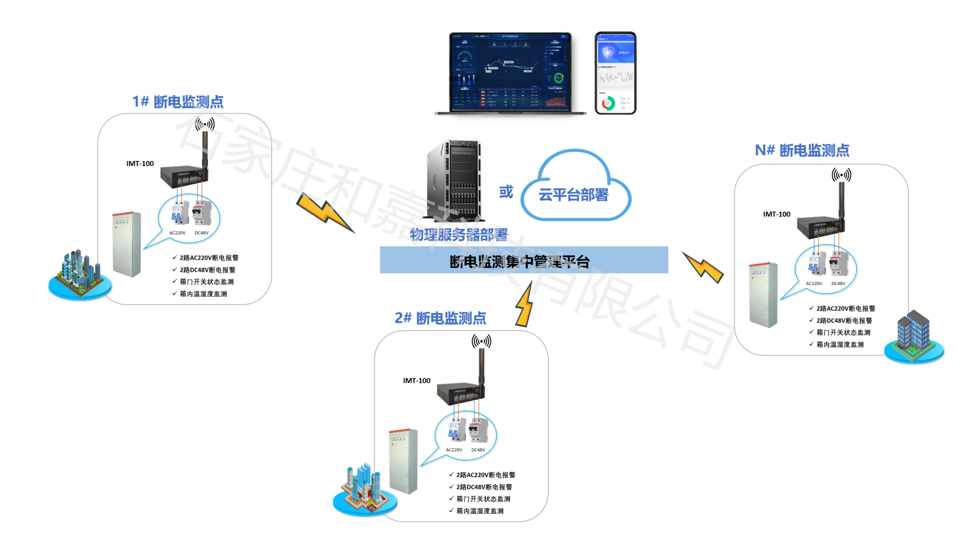 監測終端:4G無線智能運維終端集合斷電故障報警功能,可實時監測被監測對象的供電狀態,通過內置4G模塊經4G無線網絡傳輸至集中監控平臺。