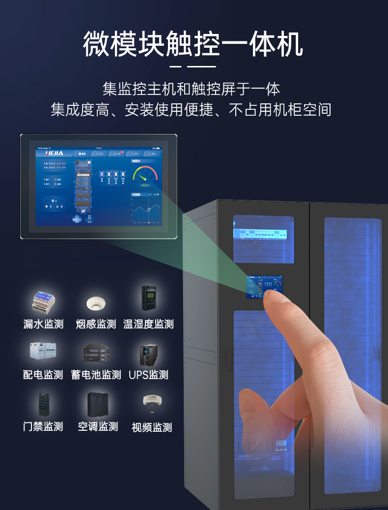 微模塊觸控一體機是我司自主研發的一款應用于微模塊數據中心的新一代動環監控主機。產品集監控主機和觸控屏于一體,具有集成度高、安裝使用便捷、不占用機柜空間等特點;可實現對微模塊數據中心重要環境及動力等設備的監控功能,實時展示所監控的設備運行情況,并可本地查詢設備運行狀態。產品適用于智能微模塊單柜、智能微模塊單排柜。 正面圖