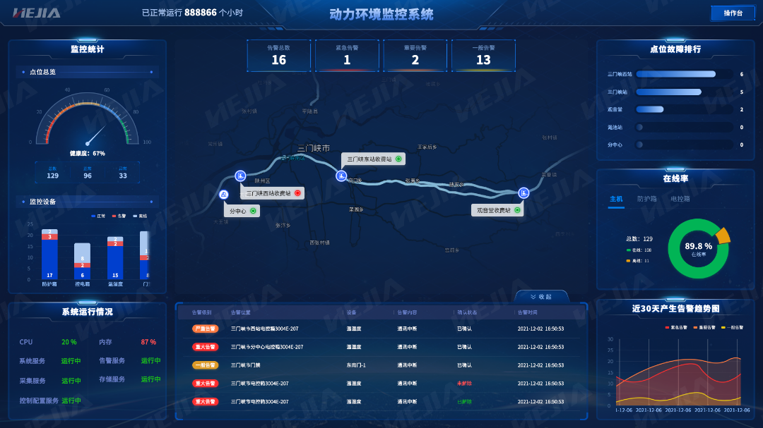 ETC一體化機柜采用室外標準機柜、動環監測及安防監控單元、空調溫控系統、模塊化電源、電池組供配電單元等部分構成,為車道控制器、RSU 天線控制器、視頻抓拍系統終端控制器、工業交換機等設備等設備提供安裝空間。設備機柜內置UPS不間斷電源和機柜空調,為柜內設備提供可靠供電和較好工作環境。ETC一體化機柜內監測單元核心是動力與環境監控主機,并通過RS232/RS485串口將UPS不間斷監控數據和空調運行數據接入至動環監控主機,實現遠程狀態監測。在高寒地區還需配置保溫層和加熱單元,以滿足低溫環境下柜內設備的穩定運行;柜內配置攝像機,可實現開門抓拍;配置溫濕度傳感器、漏水檢測線、煙感探測器等檢測單元,保證機柜的安全運行。 智能運維箱安裝在高速公路服務區的外場設備處,抱桿安裝。智能運維箱可以監測外接設備的實時電壓、電流、能耗情況、通信狀態,當出現網絡中斷、市電中斷、攝像機黑屏等告警時,智能運維箱能準確判斷故障原因并通過后備電源和后備無線傳輸(GPRS/3G/4G/NB-IoT)及時上傳監控中心通知運維人員處理,可以降低整體運維成本,提高維護工作效率,有利于維護工作的系統化和規范化管理。 系統運維平臺