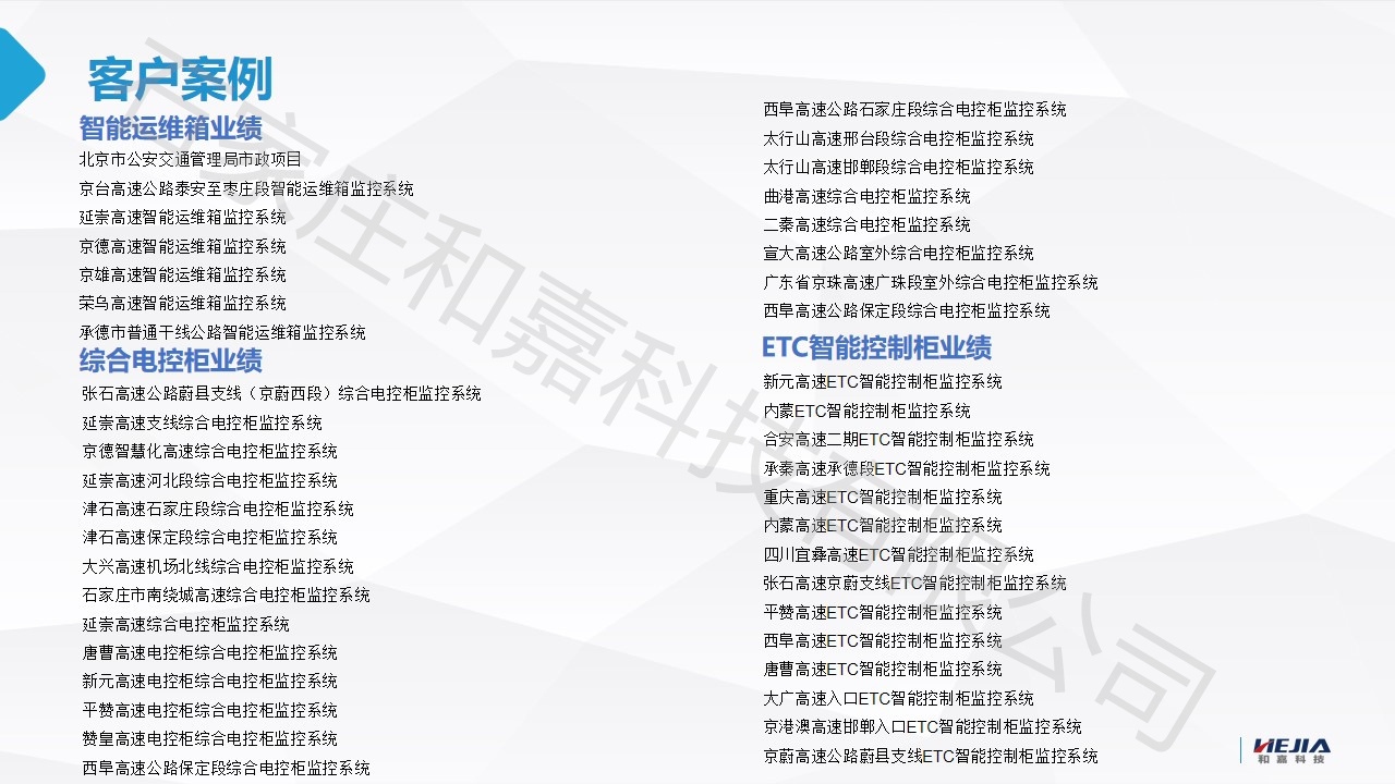 石家莊和嘉科技主營動力環境監控系統、傳感器、智能監控箱、變電站智能輔控屏柜、智能電控柜、ETC門架智能控制柜等產品