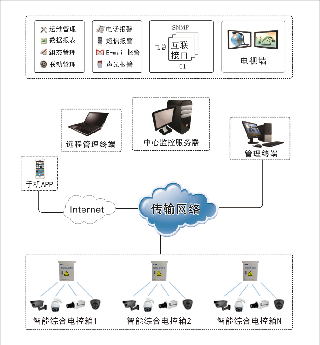 室外綜合電控柜運維管理系統是專為滿足高速公路全程監控要求,自主研發的一款集遠程監測、智能集中供電、防雷、動環監控、遠程復位、報警處理等功能為一體的室外綜合電控柜運維管理系統。可以實現對外場監控攝像機、情報板和氣象站等設備運行狀態的監測,及對設備柜內的供電系統、工業以太網交換機、防雷器和柜內溫濕度等設備運行狀態的監測,當監測到全程監控系統中任何一個設備發生故障時,柜內嵌入式監控主機通過以太網、2G/3G/4G、NB-IOT等多種網絡將采集的設備運行信息和報警信息上傳到監控中心或云運維平臺,實現集中監控,集中報警,并告知管理員;當監測到攝像機出現死機、丟失圖像等故障時可以通過遠程控制進行復位排除故障;并在監控的同時實時記錄和處理各種設備運行及報警數據,對設備的供電系統、網絡系統進行綜合管理,以保障設備穩定運行、提高管理人員工作效率,實現機電設備的少人或無人值守。同時,室外綜合電控柜還提供了豐富的接口資源,如開關量輸入接口、繼電器輸出接口、RS232、RS485接口、以太網接口、電源輸出接口,方便其它設備的接入與供電。其系統設計運行穩定、操作方便獲得用戶一致好評。